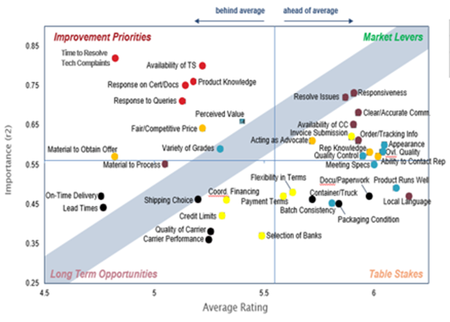 One essential element of commercial due diligence is identifying a company's strengths and weaknesses. This process examines the company's overall performance on critical product and service attributes. Typical attribute headings included in this element of commercial due diligence are product quality, sales and marketing, service and delivery, technical support, customer service, price, and value. It is also recommended that attribute importance also be collected. This will allow attribute performance to be mapped against importance, creating a performance improvement map highlighting important attributes where the company is underperforming. A sample improvement map is shown below.