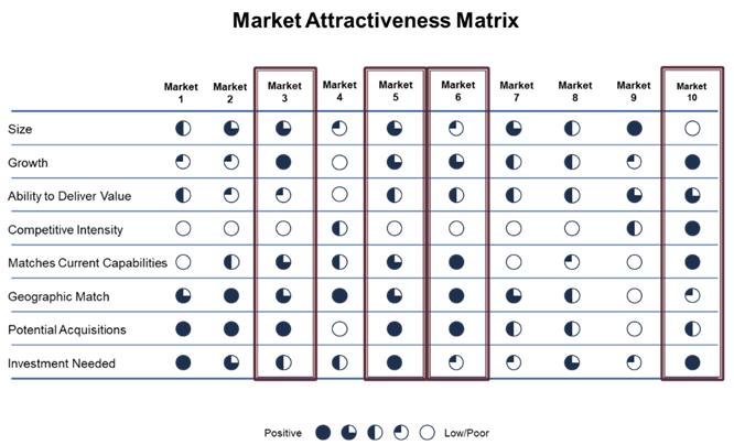 Once all of the criteria within the matrix have been given a fit and attractiveness score for each market, the most attractive markets can easily be identified. In the above chart, markets 3, 5, 6 and 10 have stand out as being the most attractive (highlighted in the above chart). Please note that actual numeric scores are typically used in calculating the overall attractiveness score for each market, and certain criteria can be weighted to provide more accurate scoring. Once completed, we recommend focusing on the top 3 to 4 markets for the next phase of research.