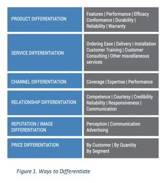 Our research indicates there are six primary ways to effectively differentiate, including product, service, channels of distribution, relationships, reputation/image, and price. Product includes actual physical and perceived differences, of which the latter can be acquired through advertising.